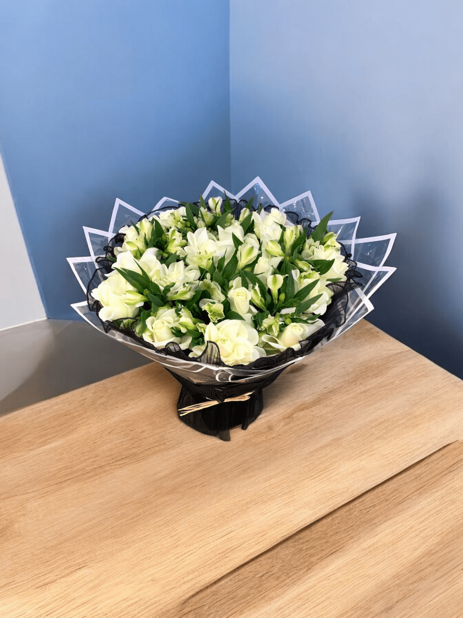 The bouquet has a fresh, modern, and elegant feel. The combination of white flowers and green foliage, along with the stylish wrapping, makes it suitable for various occasions, from casual gifts to more formal events.