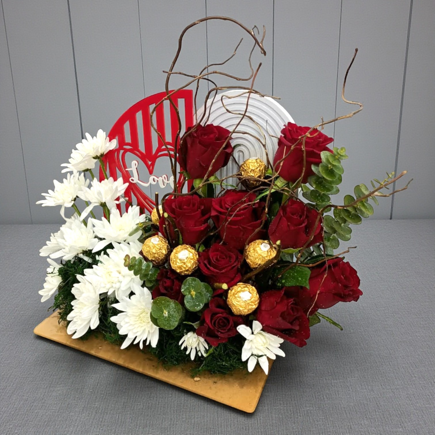 This modern floral arrangement balances the romantic depth of velvety red roses with the crisp brightness of white chrysanthemums. Interspersed with gold-wrapped Ferrero Rocher truffles and sculptural willow branches, it features a decorative Love backdrop, making it a sophisticated fusion of sweet indulgence and classic botanical beauty