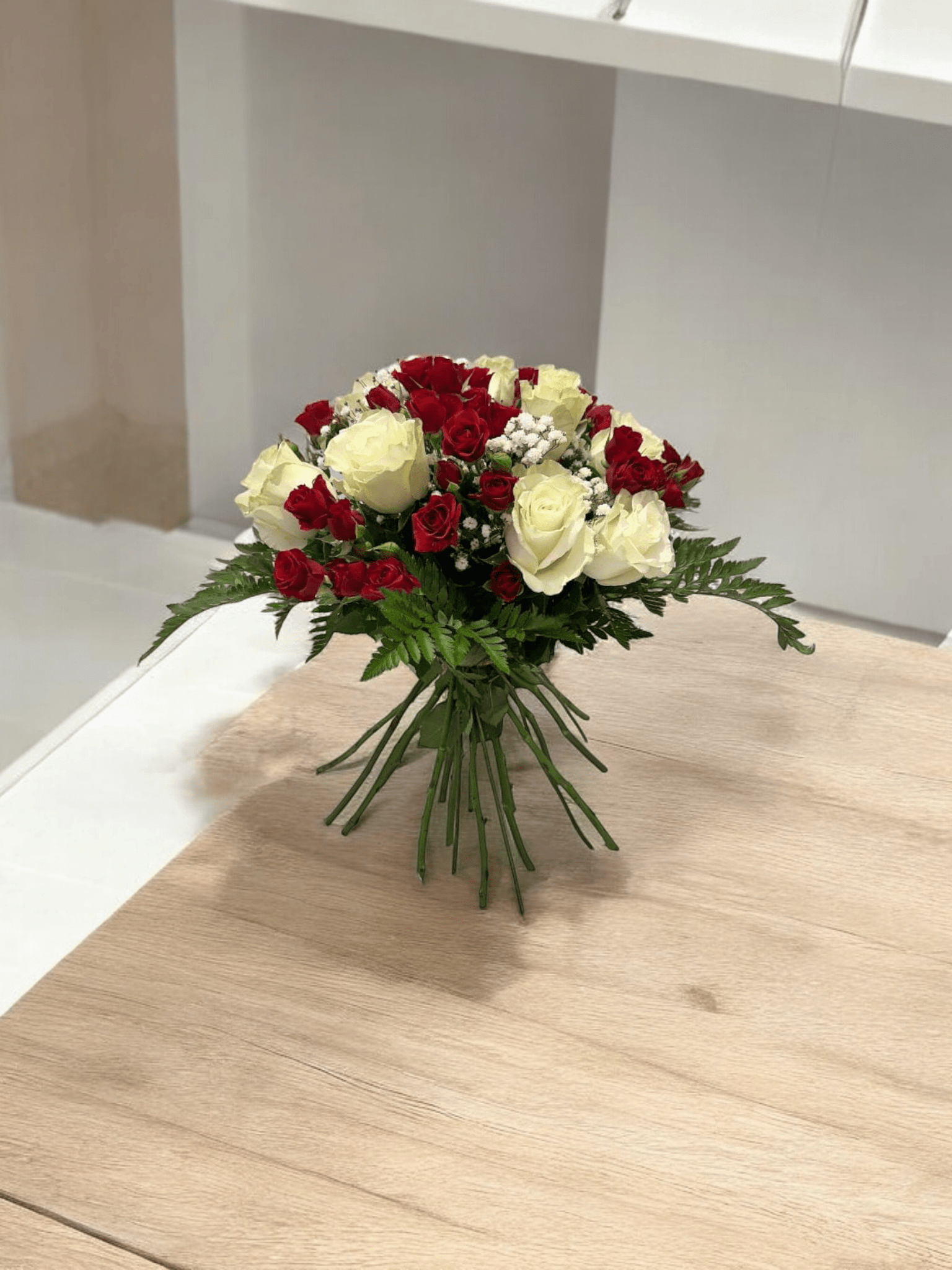 The dominant flowers are roses, in two distinct colors: deep red and creamy white (almost ivory). The red roses are smaller, possibly spray roses or sweetheart roses, while the white ones are a bit larger, giving a nice size contrast.