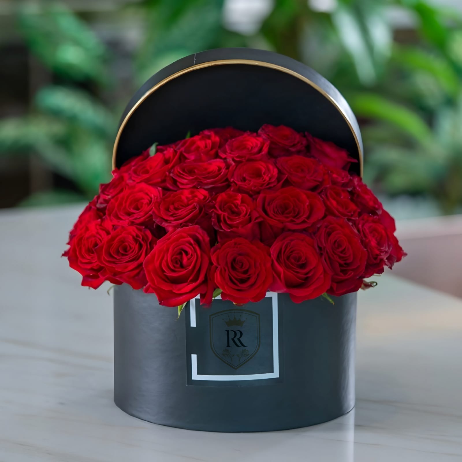 The roses are presented in a sophisticated, round hatbox. The box is predominantly black with a gold or brass-colored rim around the lid. A small, elegant label with the letter “R” in a stylized font is placed on the front of the box. The box adds a touch of luxury and elegance to the overall presentation.