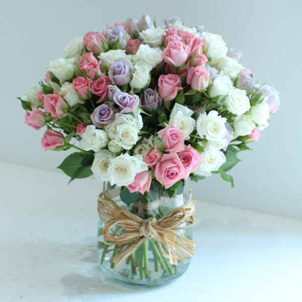 The arrangement centers around small spray roses in various pastel shades: soft pink, creamy white, and a touch of lavender or light purple. This creates a gentle and harmonious color palette.