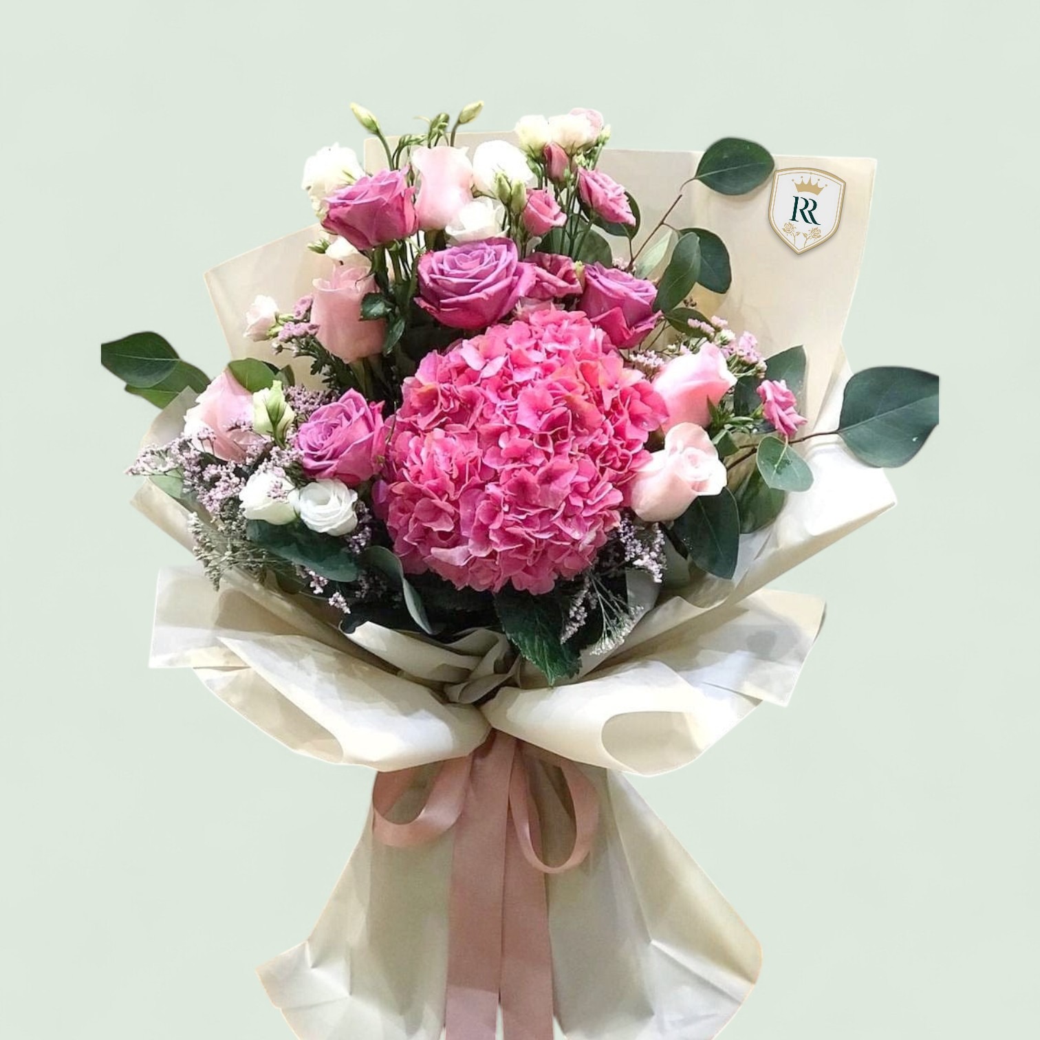 A delightful bouquet showcasing a beautiful pink hydrangea as its centerpiece, surrounded by varying shades of pink and white roses, delicate white lisianthus, and fresh eucalyptus leaves. Elegantly wrapped in soft cream paper and tied with a gentle pink ribbon, this arrangement exudes tranquility and charm, perfect for expressing affection and care.