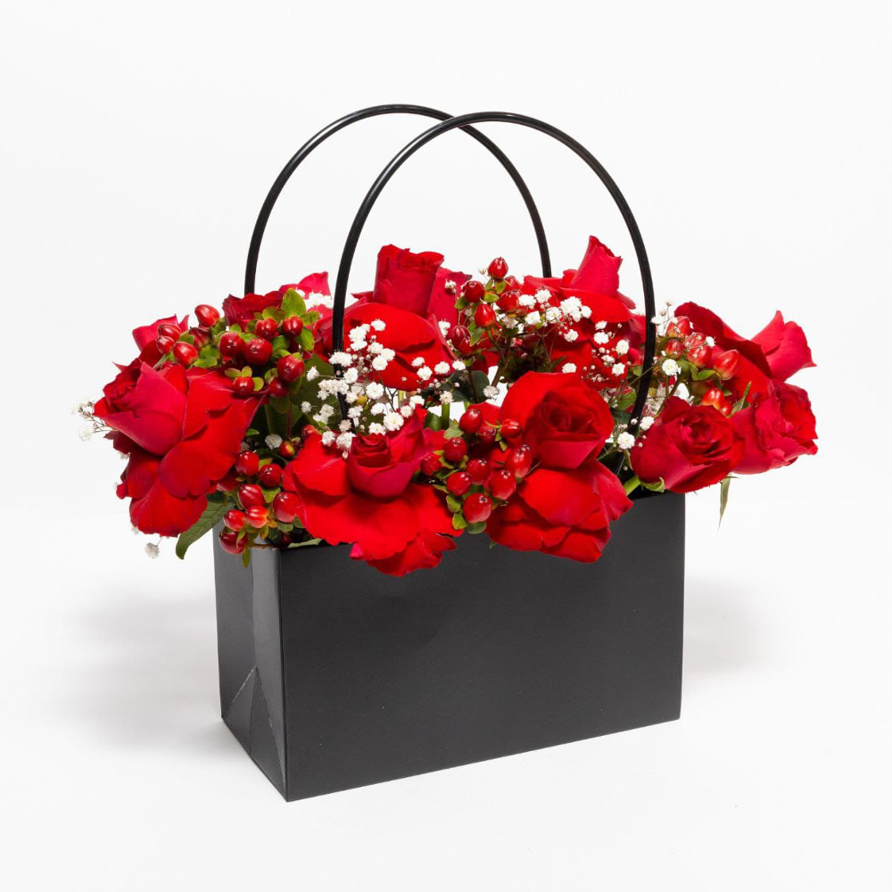 The arrangement has a modern, elegant, and sophisticated feel. The contrast between the red roses and the black bag creates a striking visual impact. It’s a stylish and convenient way to present a gift of flowers, suitable for various occasions, including romantic gestures, birthdays, and other celebrations.