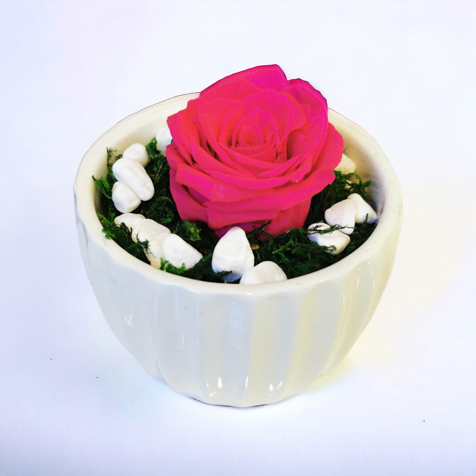 The rose is placed in a small, white, rounded container. The base of the rose rests on a bed of dark green moss or similar material. Small, white stones or pebbles are arranged around the base of the rose, creating a simple yet elegant setting. The arrangement is compact and self-contained.