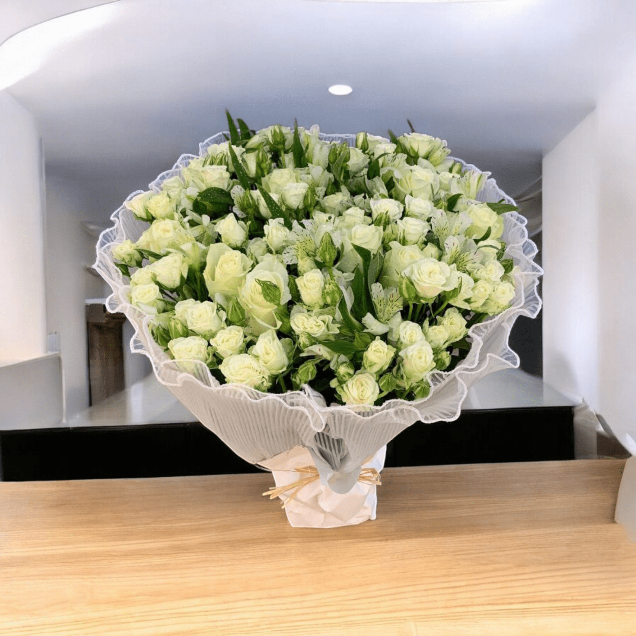 The bouquet is predominantly white, creating a sense of purity, elegance, and serenity.