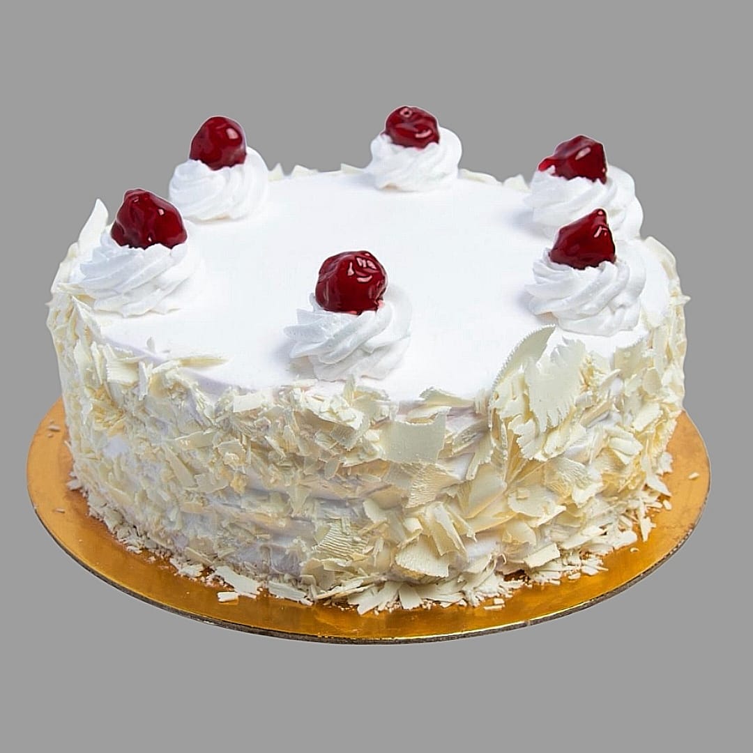A soft vanilla sponge layered with cream and black cherry filling inside.Completely covered in white chocolate shavings for decoration and taste.